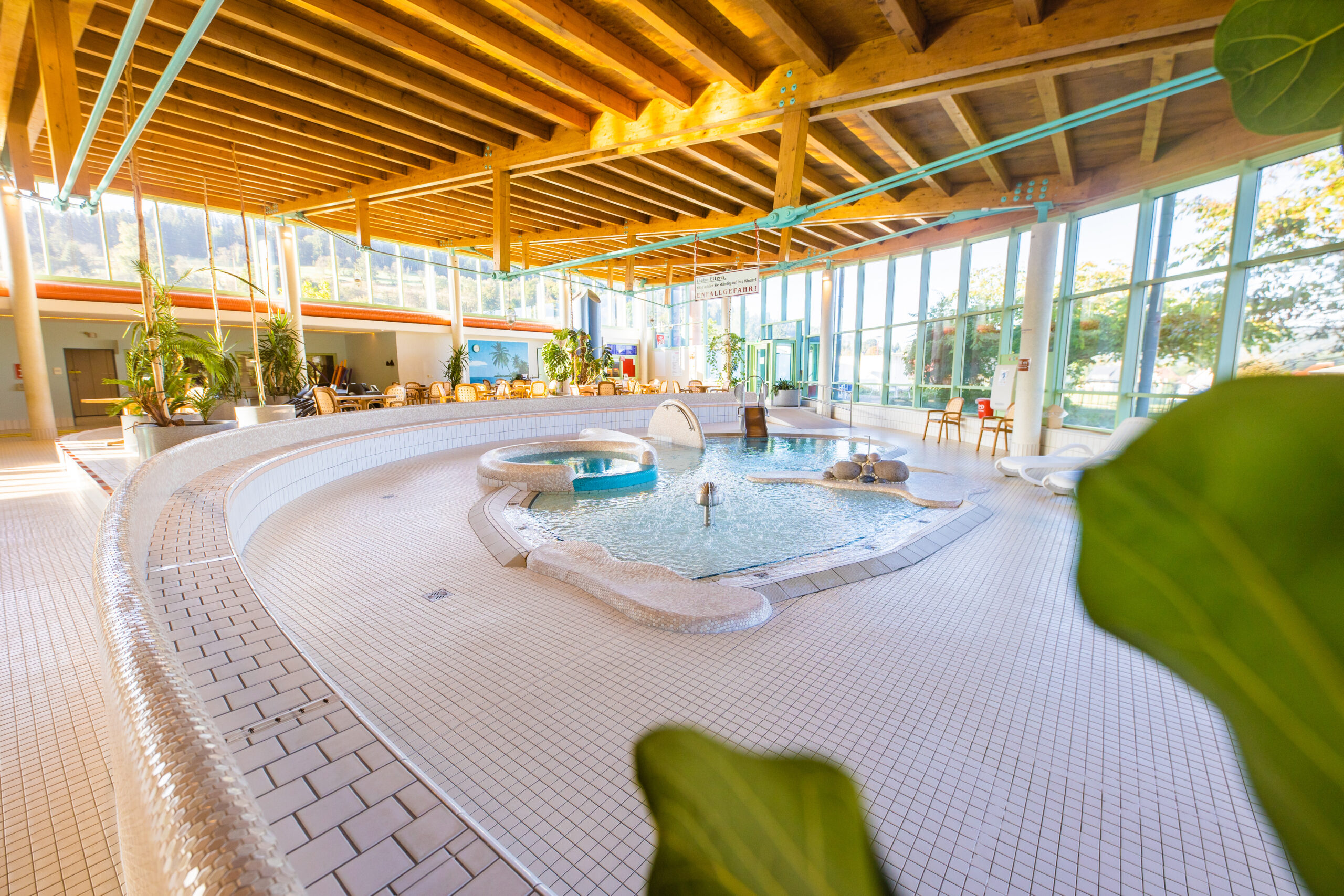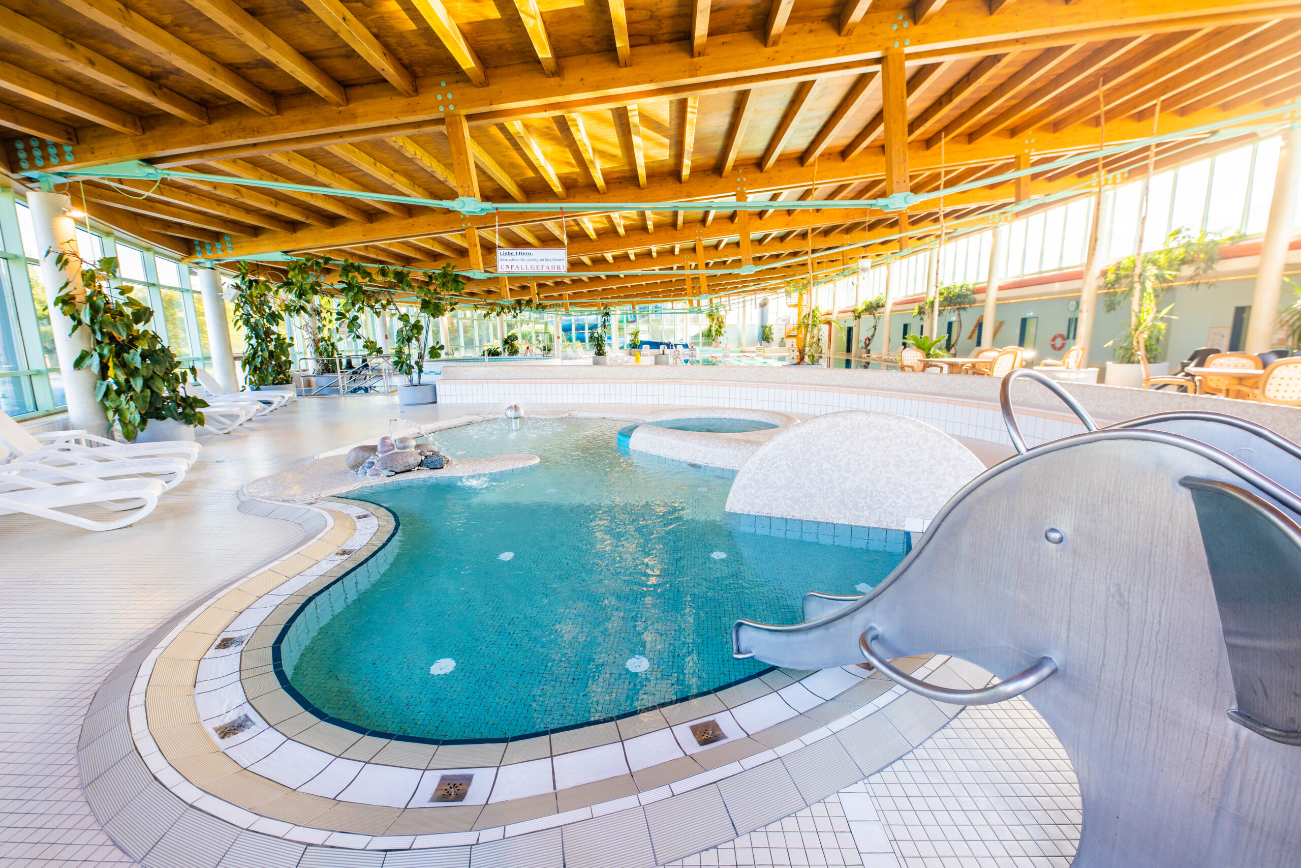 In Badesachen dürfen die kleinen Gäste die Wärme und die extra für sie zusammengestellten Aufgüsse genießen. So duftet die Sauna dann nach Biene Majas Blumenwiese, exotisch nach Dschungel-Fieber oder geheimnisvoll orientalisch mit dem Aladin-Aufguss.