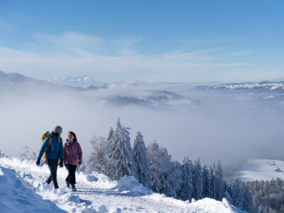 Die Bergwinter-Erlebnistage finden sowohl vom 12. bis 16. Januar 2026 als auch vom 23. bis 27. Februar 2026 statt. Ebenfalls zum Programm gehören Schneeschuhwanderungen für Einsteiger, Stirnlampen- und Fackeltouren und Panoramatouren am Oberstaufener Hausberg Kapf. Diese verführen mit einem schönen Dreiländerblick und der Einkehr im Café Paradies. Die Angebote der Bergwinter-Erlebnistage sind ab dem 9. Oktober buchbar unter   oberstaufen.de/bergwinter